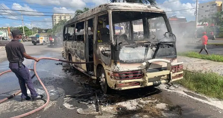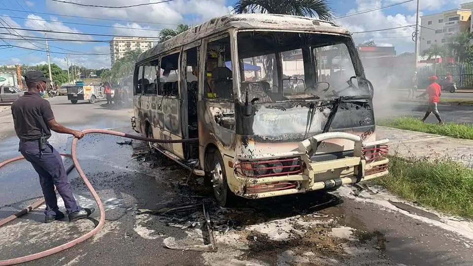 LA ROMANA.-Personal del Cuerpo de Bomberos de La Romana sofocó en la mañana de este jueves el incendio en un minibús del transporte, en la avenida Francisco Alberto Caamaño Deñó, de la referida demarcación.