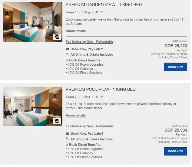 La habitación más económica es la Premium Garden View con cama King size y 411 metros cuadrados, el costo es de 31,529 pesos, antes de descuentos.