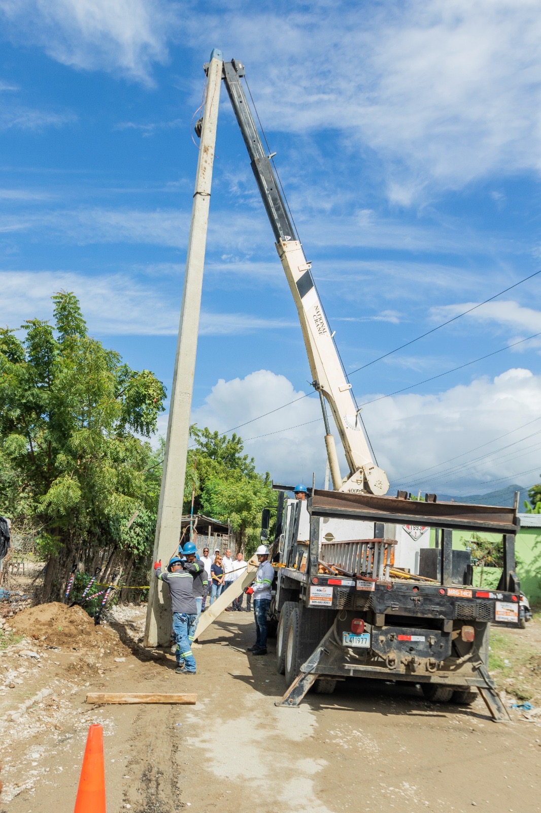 El administrador general Milton Morrison, encabezó el izado del primer poste de concreto, acompañado de la gobernadora civil y provincial Grey Pérez, y de líderes comunitarios, marcando el inicio de unos trabajos esperados durante años.