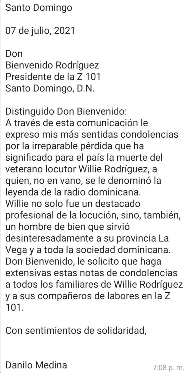 A través de una carta enviada a Bienvenido Rodríguez, presidente de la estación de radio, el presidente del Partido de la Liberación Dominicana expresó sus condolencias por la muerte del locutor a sus 72 años.