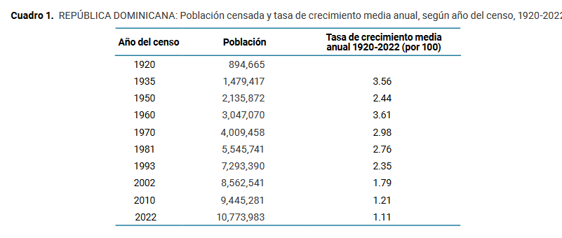 Santo Domingo.– Santo Domingo.- Los datos presentados de manera preliminar en agosto de 2023 señalaban que el total de habitantes en la República Dominicana era de 10,760,028 cifra que aumentó mínimamente a 10,773,983, según el X Censo de Población y Vivienda 2022 publicado este jueves.
