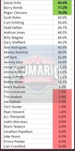 Los legendarios peloteros norteamericanos Barry Bonds (77,2%) y Roger Clemens (76,0%), quienes aparecen en la papeleta de los escritores por décima y última vez, también superan el porcentaje necesario, aunque por escaso margen. Ningún otro candidato alcanza el 60%.