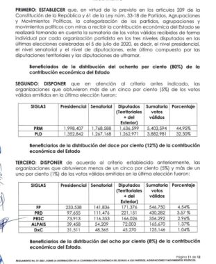 Según la Ley 33-2018 sobre partidos, agrupaciones y movimientos políticos, se establece que el 80% de los recursos asignados por el Poder Ejecutivo para ser repartidos entre los partidos políticos será redistribuido en partes iguales entre esas dos organizaciones.
