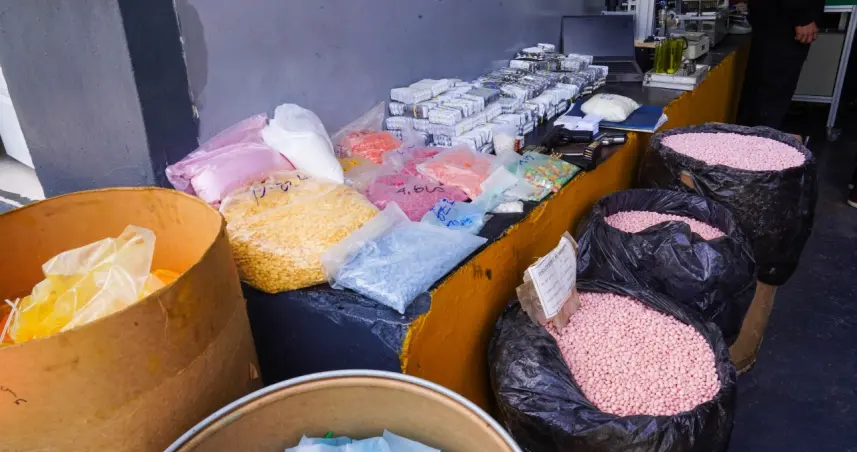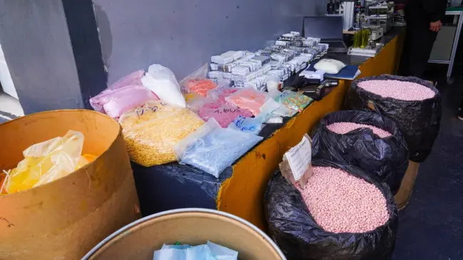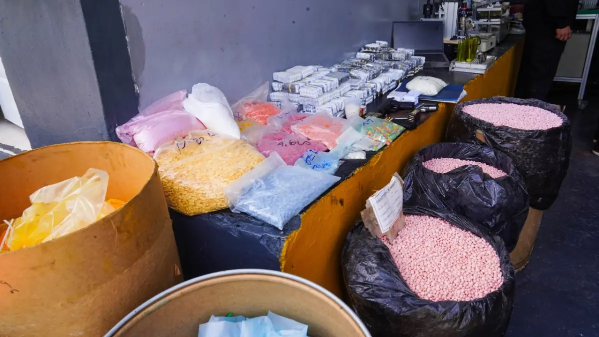 También incautaron dos armas de fuego de diferentes calibres, 76 tanques, 86 cajas llenas de pastillas y 34 máquinas que se utilizaban para la mezcla, llenado, pesaje, blisteado y etiquetado de los productos.