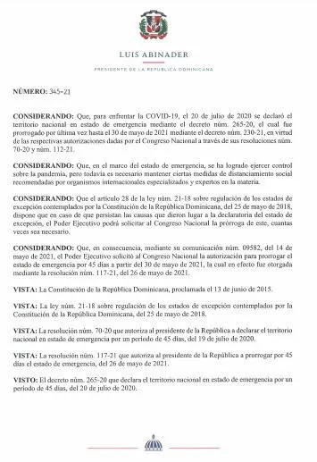 SANTO DOMINGO.- El gobierno emitió este miércoles el decreto 345-21, el cual dispone prorroga de 45 días de estado de emergencia en todo el territorio nacional.