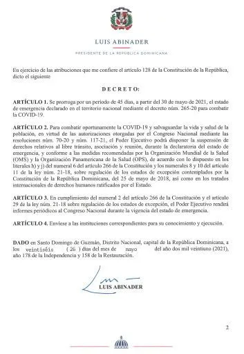"Se prorroga un periodo de 45 días, a partir del 30 de mayo de 2021, el estado de emergencia declarado en territorio nacional mediante el decreto número 265-20 para combatir el COVID-19", dice el decreto emitido este miércoles.