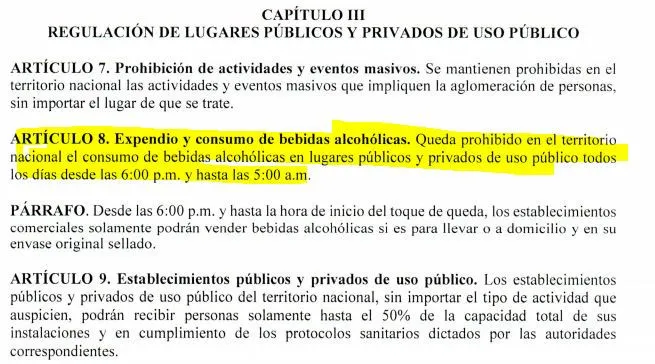 SANTO DOMINGO.- Mediante el decreto 419-21 que regula un nuevo toque de queda en el país, el Gobierno dominicano informa que queda prohibido en el territorio nacional el consumo de bebidas alcohólicas en lugares públicos y privados de uso público todos los días desde las 6:00 de la tarde hasta las 5:00 de la mañana.