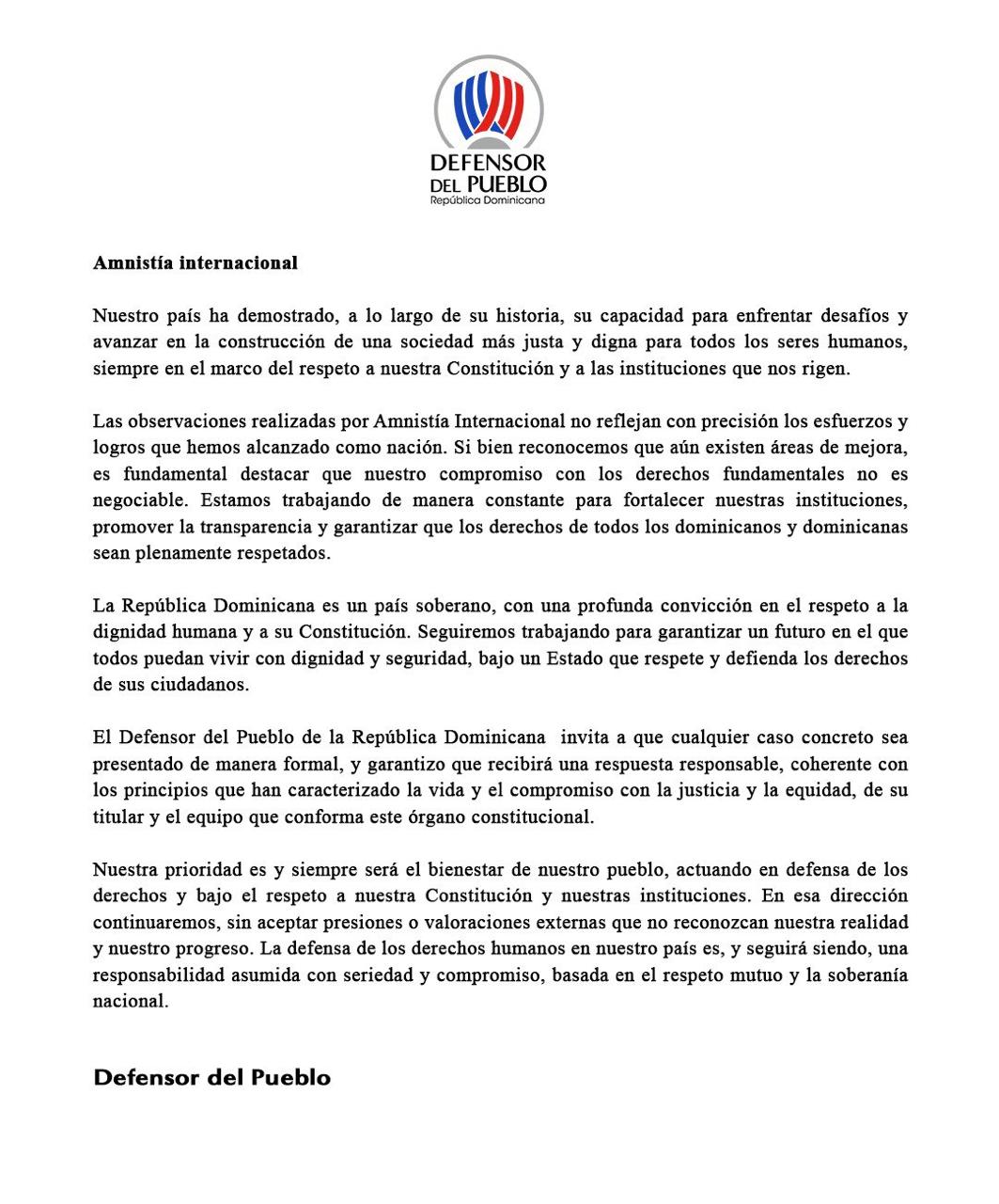 “Las observaciones realizadas por Amnistía Internacional“, dice, “no reflejan con precisión los esfuerzos y logros que hemos alcanzado como nación. Si bien reconocemos que aún existen áreas de mejora, es fundamental destacar que nuestro compromiso con los derechos fundamentales no es negociable. Estamos trabajando de manera constante para fortalecer nuestras instituciones, promover la transparencia y garantizar que los derechos de todos los dominicanos y dominicanas sean plenamente respetados”.