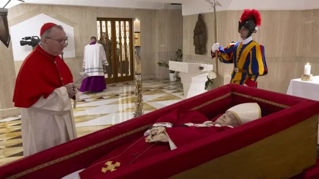 El ataúd con el cuerpo de Francisco, fallecido este lunes a los 88 años debido a un ictus tras meses sufriendo graves problemas respiratorios, está siendo velado en estas horas en su residencia de la Casa Santa Marta por expreso deseo del papa, que hizo algunos cambios en las reglas para simplificar los funerales de los pontífices.
