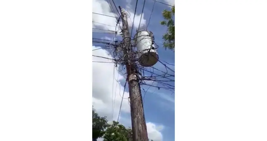 El tendido eléctrico se mantiene en pie por una soga que lo conecta a un árbol cercano, aseguraron que no resistirá más.
