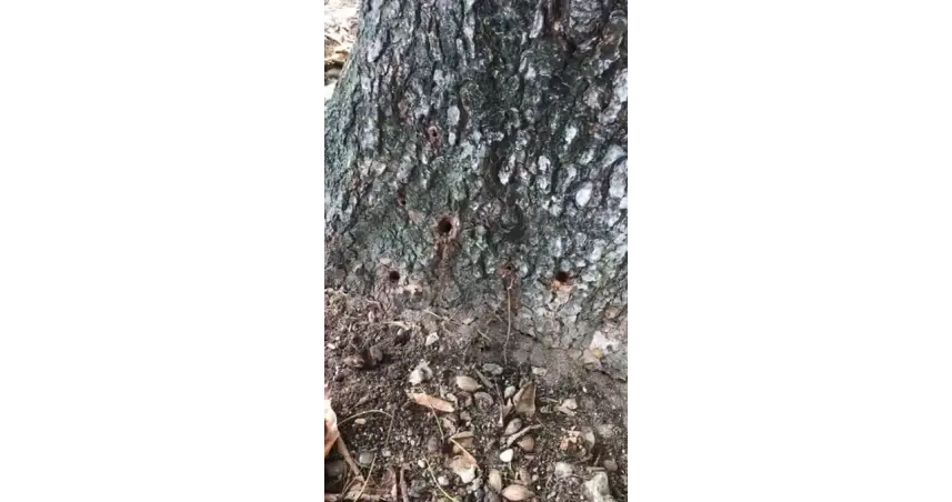 En el video adjunto obtenido desde nuestro WhatsApp, se pueden ver algunos orificios taladrados en el tronco del árbol por donde reportan que se introdujo el veneno, también se nota la sequedad de los ramos y las hojas.
