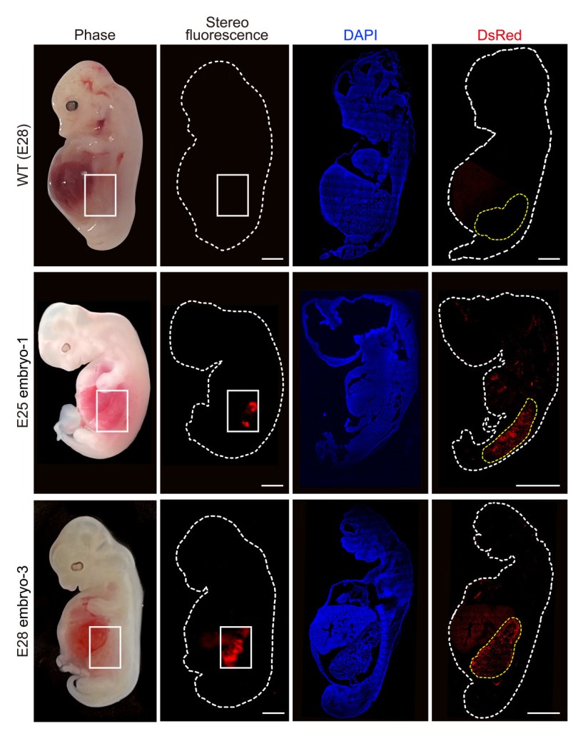 La figura muestra células renales humanizadas (fluorescencia roja) dentro del embrión en comparación con un embrión enteramente porcino. Crédito: Wang, Xie, Li, Li y Zhang et al./Cell Stem Cell.
