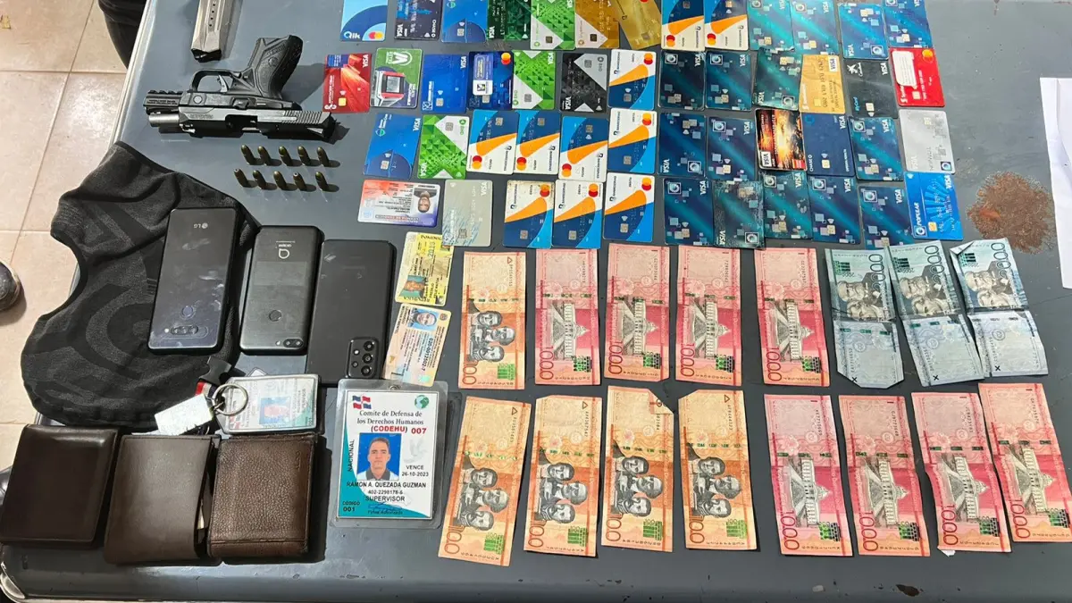 Al momento de la requisa protocolar, a Ramón Alexander Quezada Guzmán, se le ocupó la pistola marca Ruger, numeración limada, con su cargador y ocho cápsulas, así como también 47 tarjetas de crédito de diferentes entidades bancarias y la suma de $14,500 pesos.
