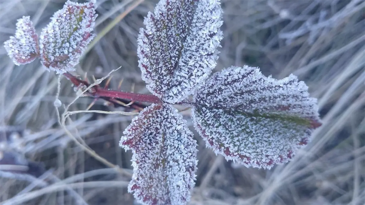 - Según los reportes, la temperatura mínima alcanzó los 0 °C en la zona de Las Pirámides, lo que provocó pequeñas formaciones de escarcha y cencellada sobre las hojas de mora silvestre.