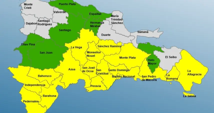 Mientras que se mantienen en alerta amarilla: Peravia, Provincia de Santo Domingo, Distrito Nacional, San Cristóbal, Azua, Sánchez Ramírez, San Pedro de Macorís, Bahoruco, Barahona, Independencia, La Vega, Monseñor Nouel, San José de Ocoa, Monte Plata, La Altagracia, La Romana, Pedernales.