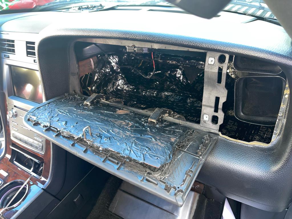 El Ministerio Público y la DNCD también localizaron una caleta en la jeepeta Lincoln Navigator, placa número, G395806, color negro, en la parte del tablero delantero. Al momento de abrirlo el compartimiento secreto estaba vacío.