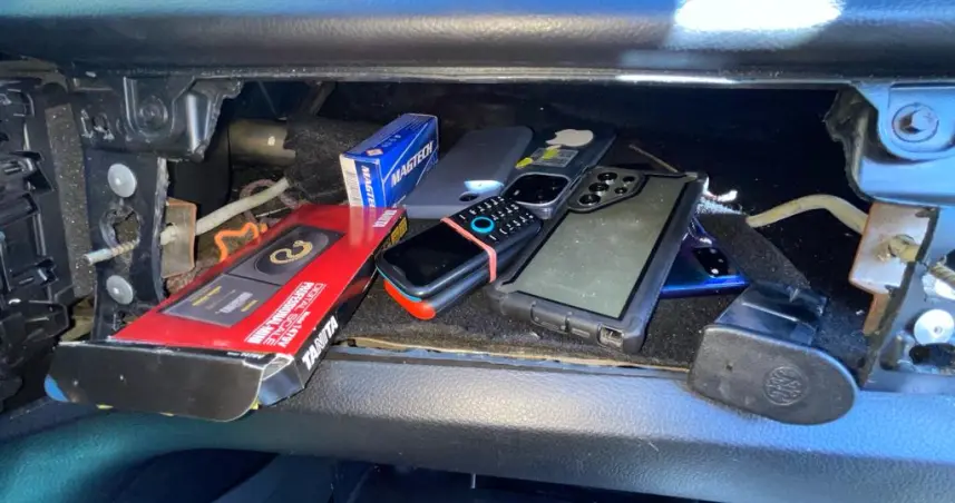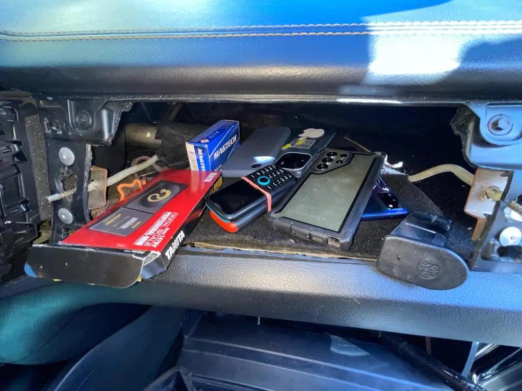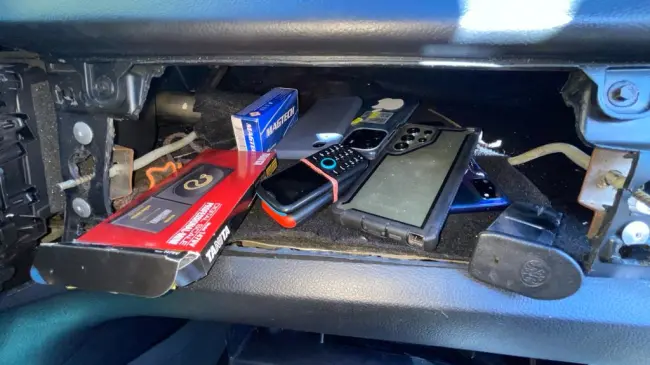 En una primera inspección, dispuesta por el fiscal actuante, se descubrió en el tablero de la parte delantera de la camioneta marca Ford, modelo Wildtrack, placa número L412709, color negro, en cuyo interior se encontró un cargador de pistola calibre nueve milímetros, una caja de cápsulas, seis celulares de diferentes marcas y modelos, una balanza y dinero en efectivo dentro de un pequeño bolso.