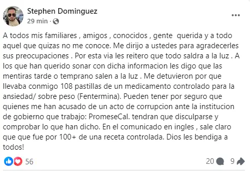 En la publicación, Domínguez asegura que las acusaciones en contra de su persona son falsas y que el incidente está relacionado con la posesión de 108 pastillas de un medicamento controlado para tratar la ansiedad y el sobrepeso, específicamente Fentermina, recetadas bajo control médico.