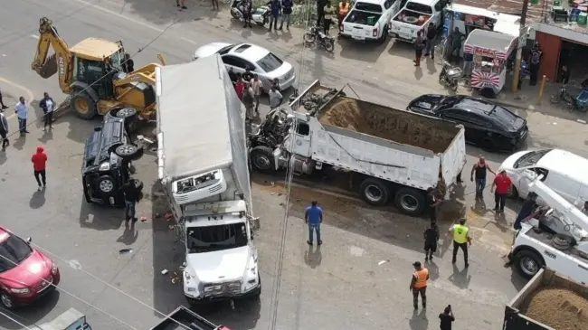 En el audiovisual se aprecia como ambos vehículos pesados son arrastrados por el choque hasta golpear una jeepeta y un autobús de pasajeros.