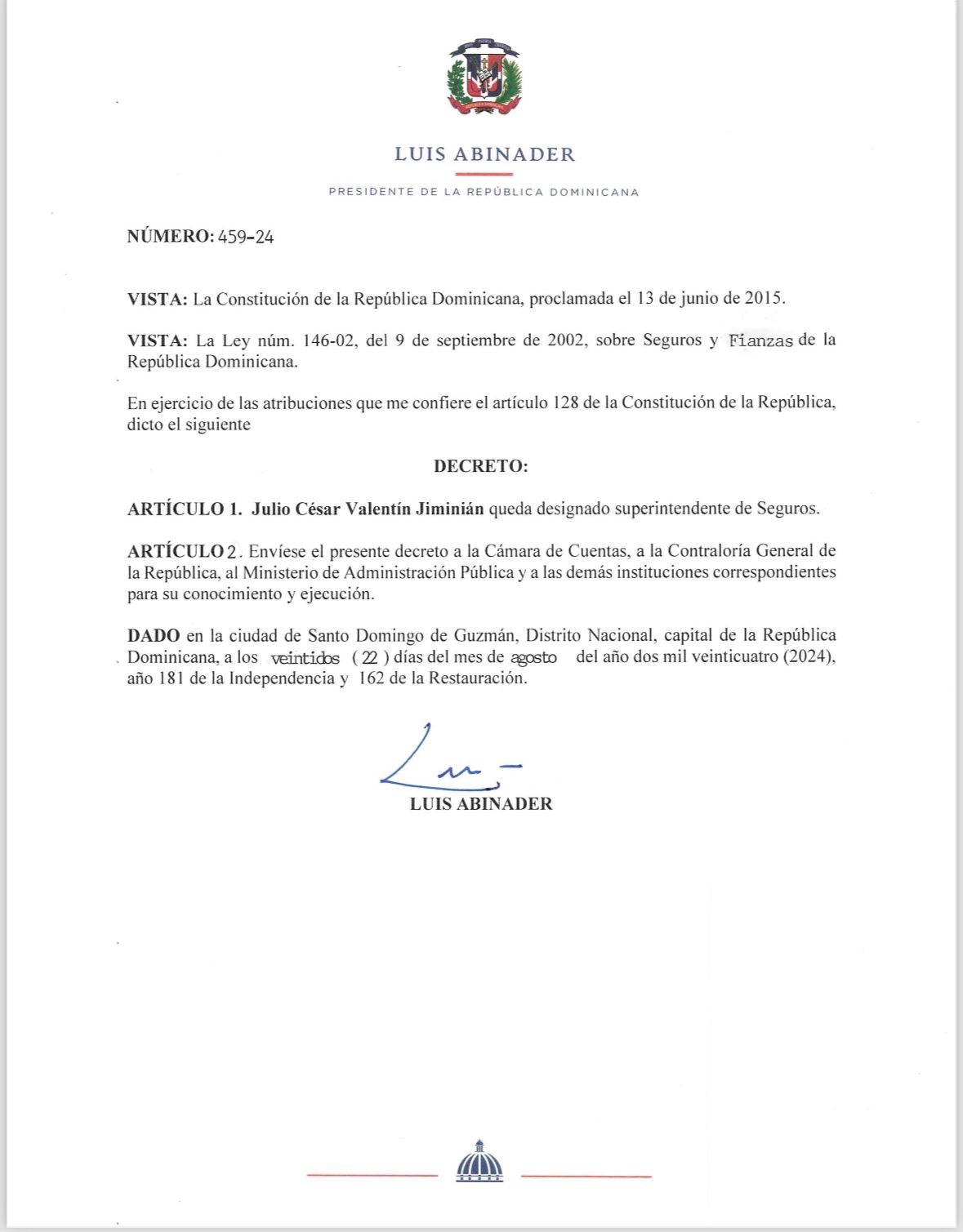 Santo Domingo.– SANTO DOMINGO.- El presidente de la República, Luis Abinader, designó este viernes a Julio César Valentín como superintendente de Seguro.