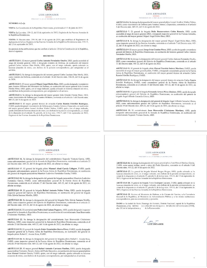 El decreto también coloca en honrosa situación de retiro a varios oficiales, entre ellos la General de Brigada Marisol Burgos Burgos, ERD, y el General de Brigada Yonis Rodríguez Luciano, FARD, ambos con disfrute de la pensión correspondiente.