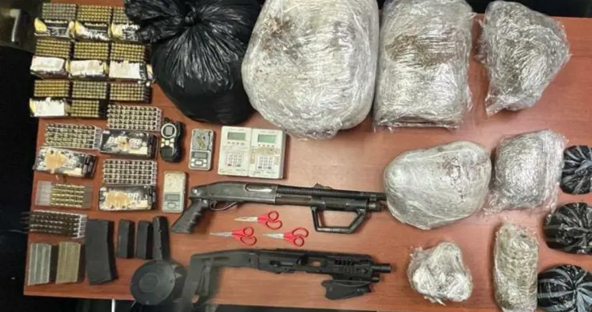 En el allanamiento en que los fiscales e investigadores incautaron 37.3 libras de marihuana, se ocuparon, también, 640 cápsulas para pistolas calibre 9 milímetros, 35 cápsulas 40 milímetros y 48 cápsulas 5.56 milímetros; además, 3 cargadores para fusil, otros 3 cargadores para Glock, uno de ellos Caracol, con capacidad para 50 cápsulas; así también una escopeta calibre 12 y un porta pistola para fusil.
