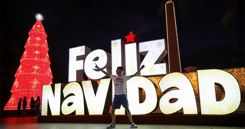 La foto muestra una escena nocturna festiva con una gran decoración navideña iluminada.