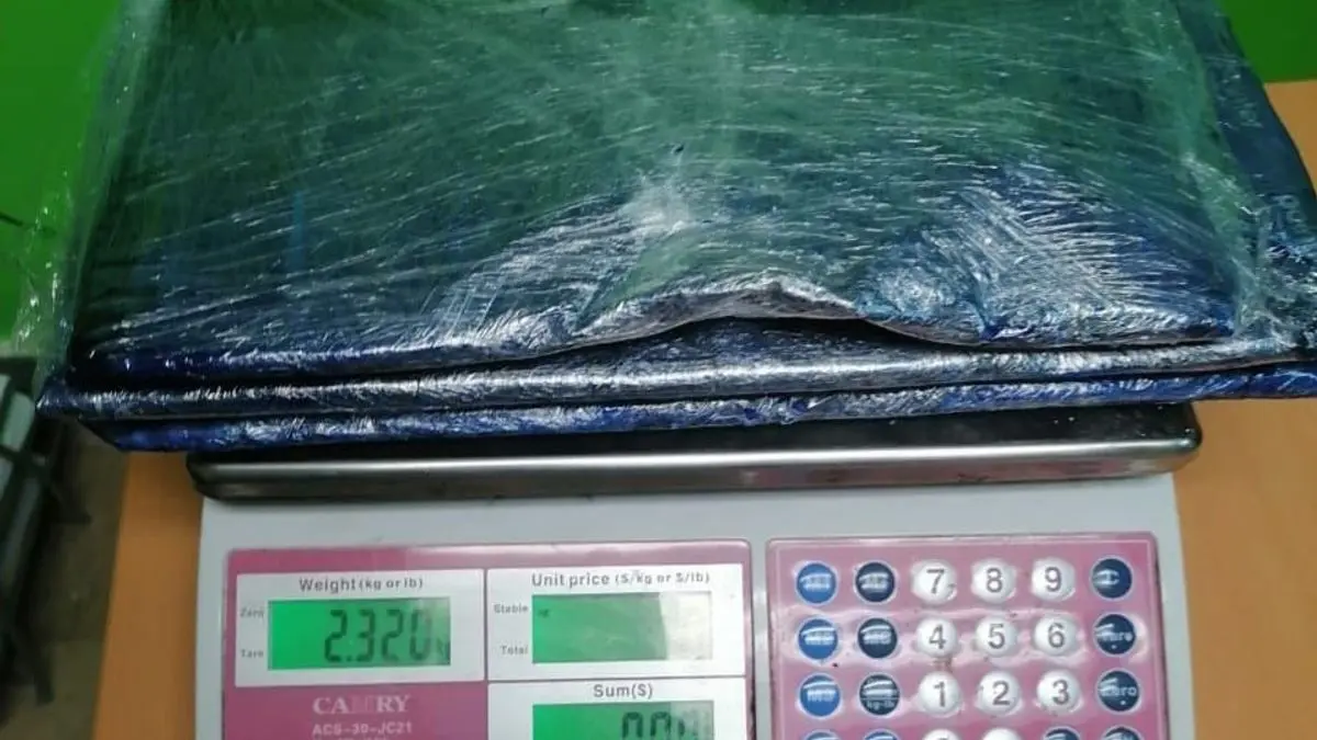 Efectivamente, en presencia de un fiscal adjunto se procedió a realizar una revisión más rigurosa al equipaje, descubriendo un doble fondo, donde se ocupó tres paquetes en forma de lámina, con un peso preliminar de 2.3 kilogramos.