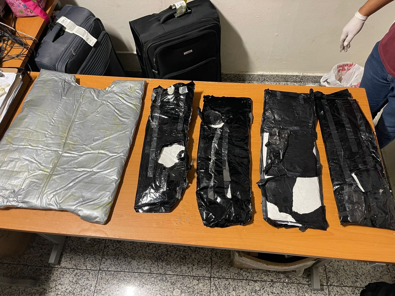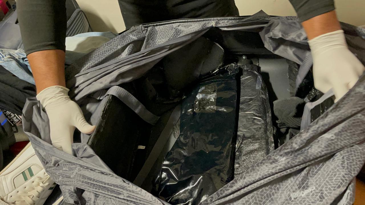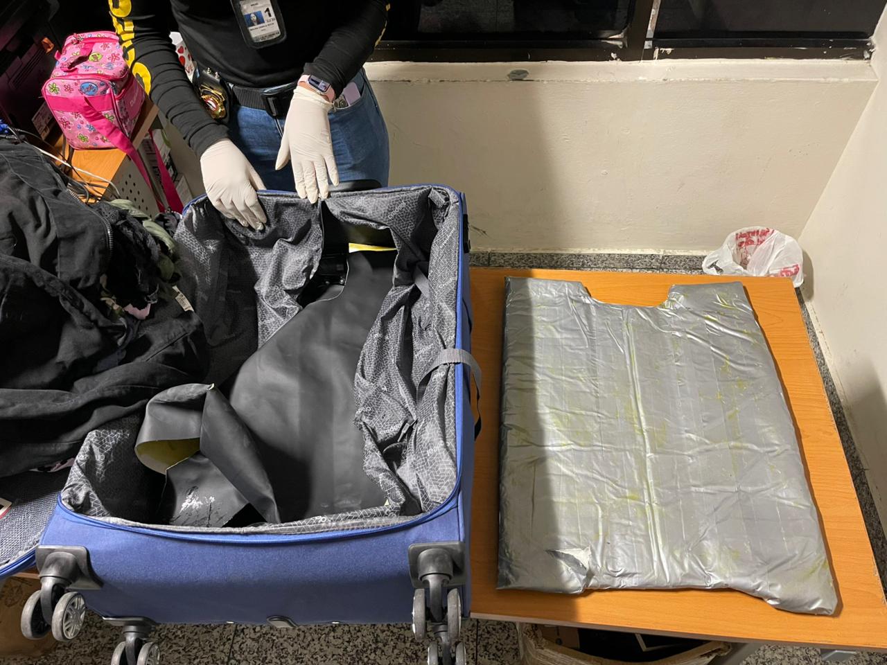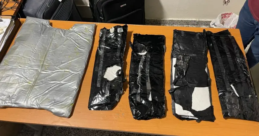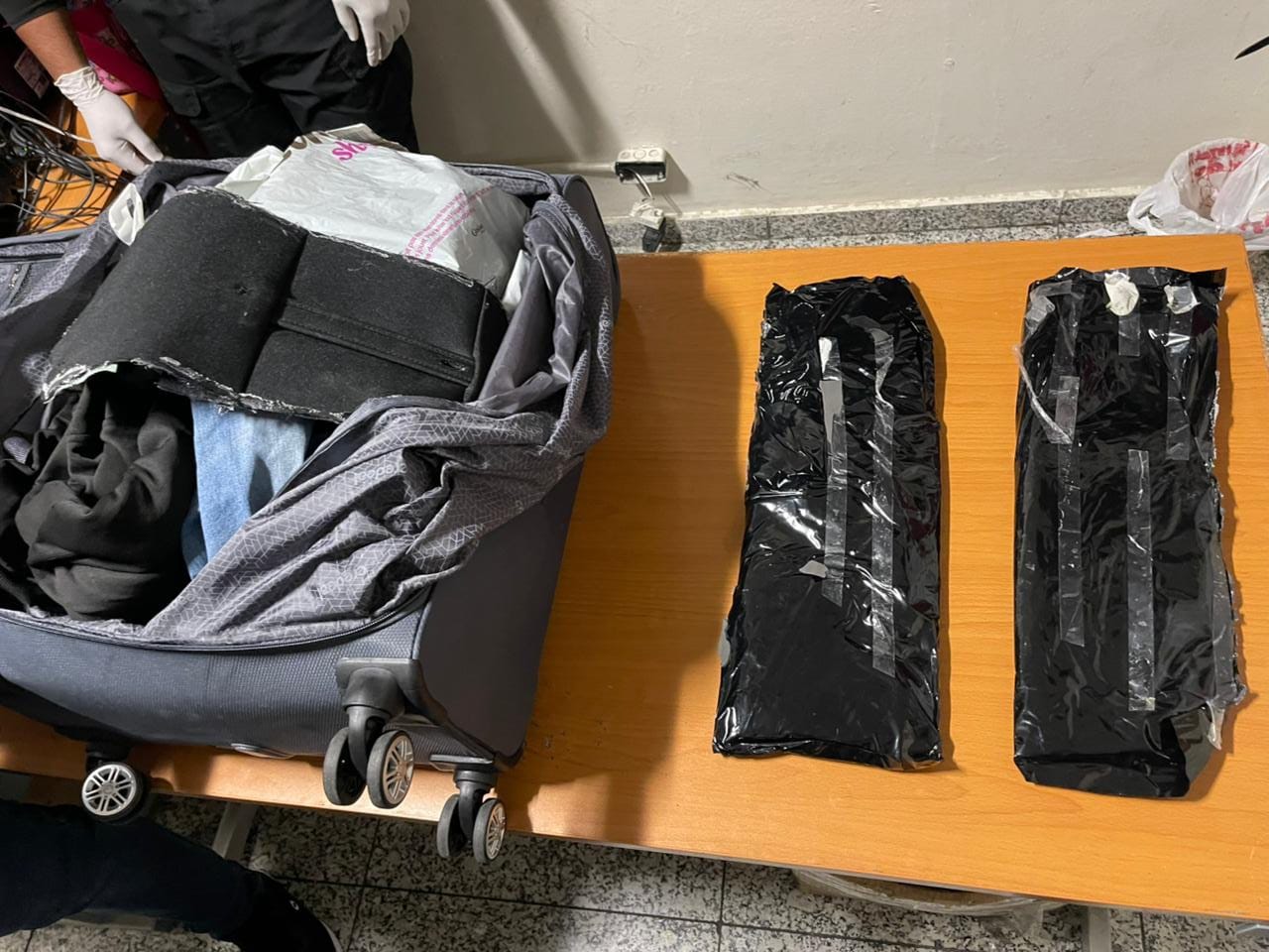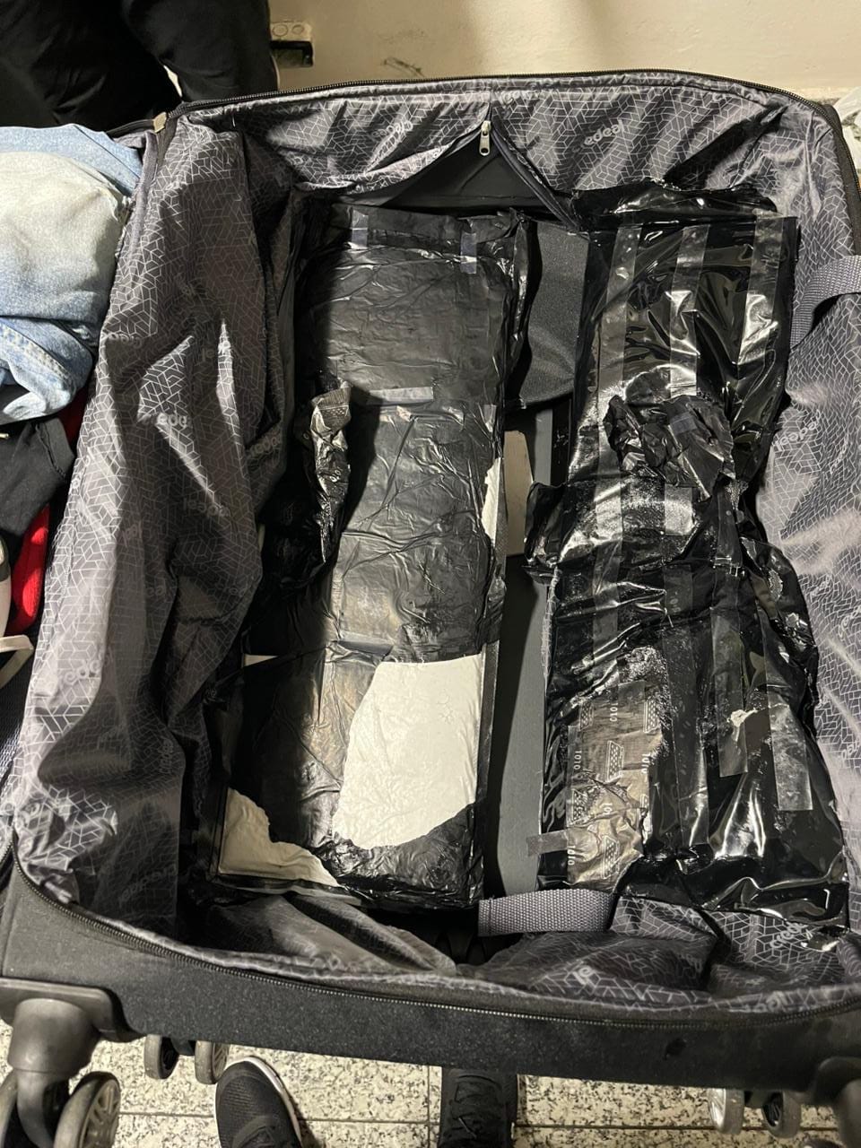 Por instrucciones del fiscal actuante y en presencia de los detenidos, se inició el protocolo de apertura de tres maletas, encontrando distribuidos, un total de cinco paquetes, envueltos en cinta adhesiva de color gris y negro, con un peso superior a los (08) ocho kilogramos presumiblemente de cocaína.