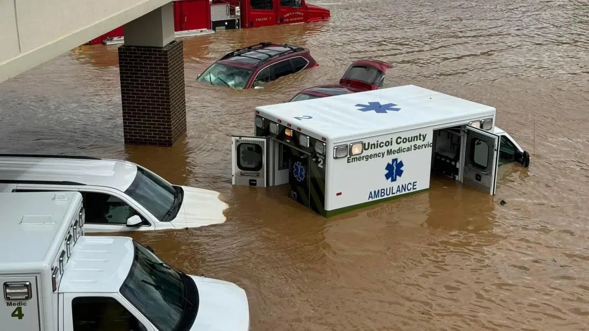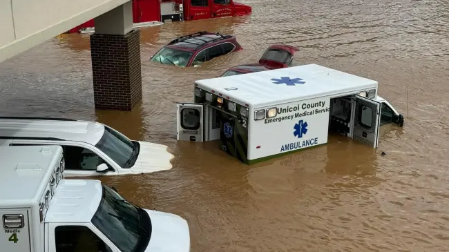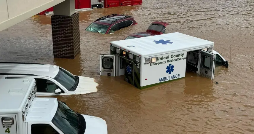 -Las ambulancias anegadas del Hospital del condado de Unicoi, en Tennessee, donde los enfermos y el personal de salud tuvieron que ser evacuados en helicópteros Blackhawk.