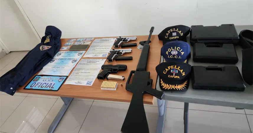 Asimismo, mediante labores de inteligencia posteriores, las autoridades interceptaron un paquete procedente de Santo Domingo que contenía otra pistola de fogueo, cápsulas, documentos y credenciales, vinculados a uno de los investigados.