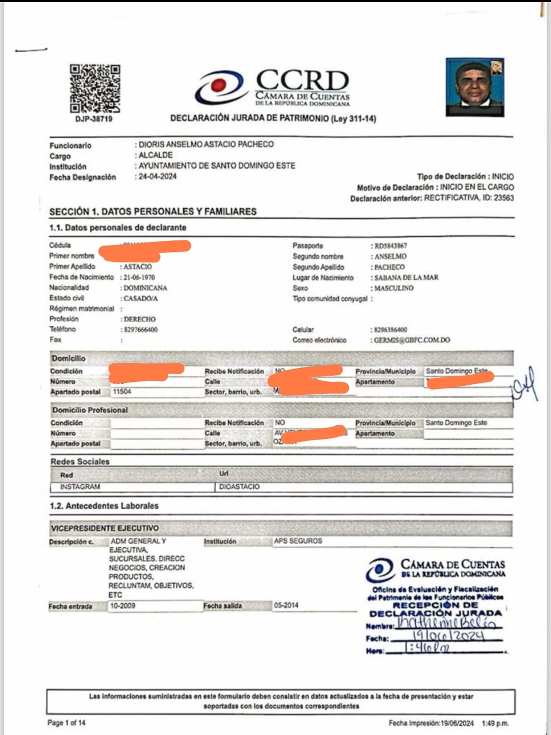 En el documento presentado por el funcionario indica que el depósito de la declaración jurada se hizo en fecha del 19 de junio del 2024, sin embargo, en la base de datos de la Cámara de Cuentas Astacio se encuentra entre los que aún no entregan, esto se deberse a que la información suministrada por la entidad solo aparece las declaraciones entregadas hasta 17 de junio 2024.