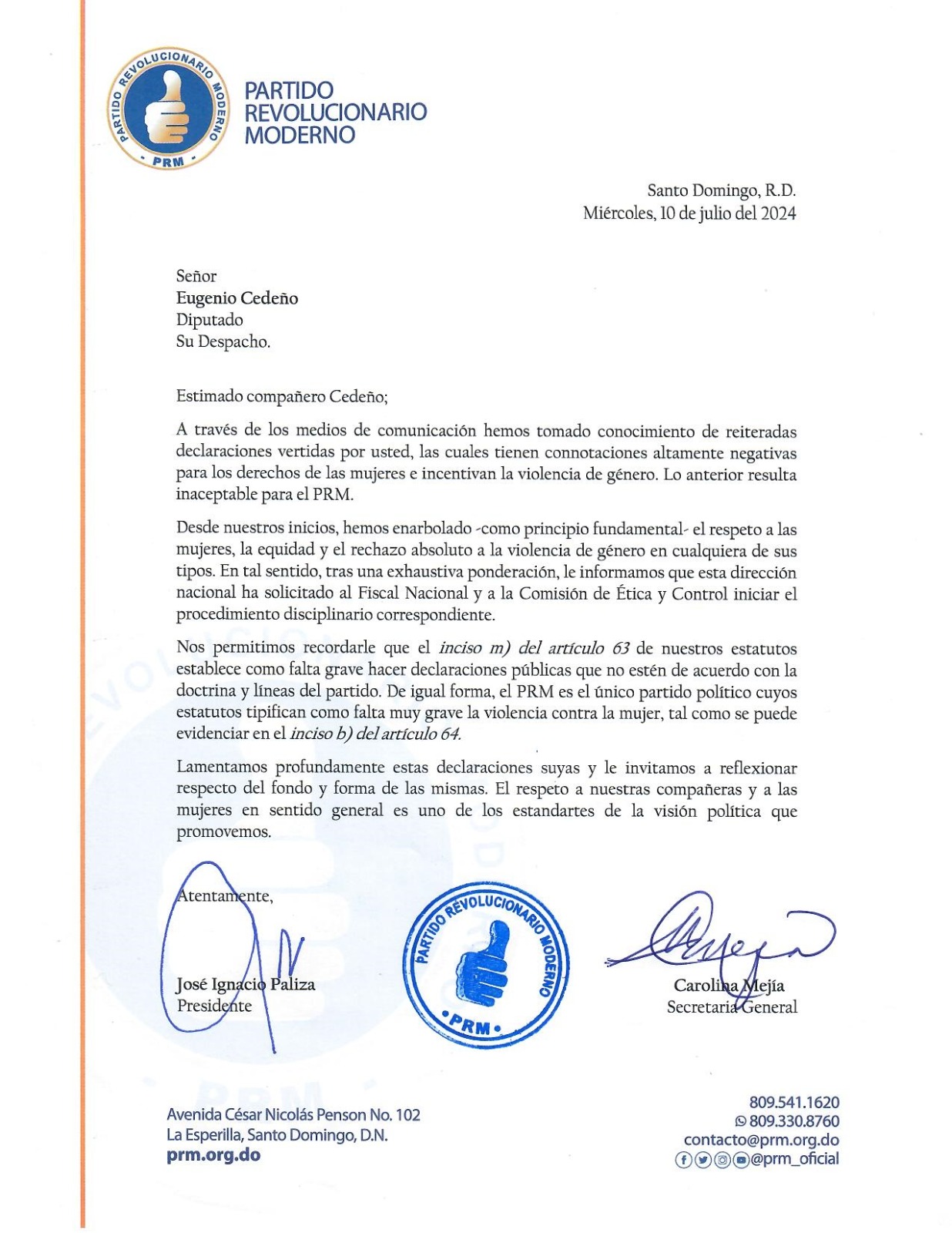“Le informamos al señor Eugenio Cedeño que esta dirección nacional ha solicitado al Fiscal Nacional y a la Comisión de Ética y Control iniciar el procedimiento disciplinario correspondiente por las declaraciones vertidas por usted, las cuales tienen connotaciones altamente negativas para los derechos de las mujeres e incentivan la violencia de género. Lo anterior resulta inaceptable para el PRM”, describe la carta.