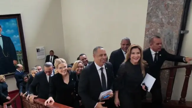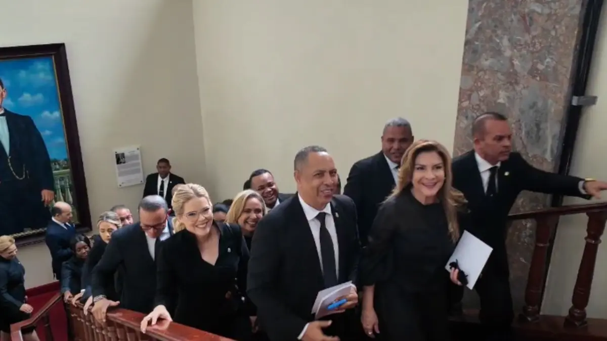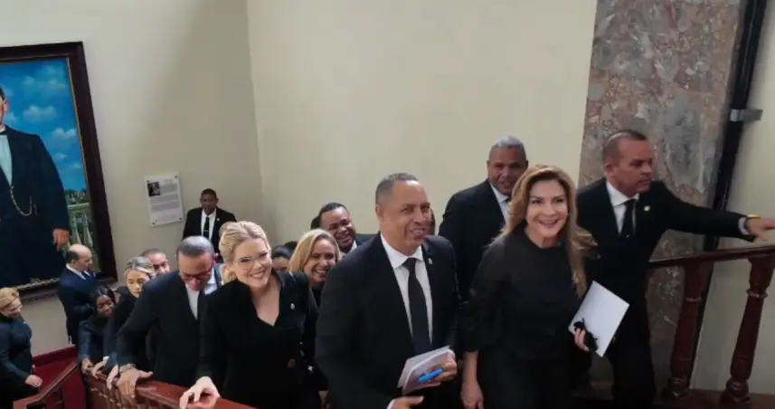 La alcaldesa Carolina Mejía ingresó al Salón de la Asamblea Nacional acompañada por numerosos diputados en apoyo a su gestión, antes de la rendición de cuentas del presidente Luis Abinader.