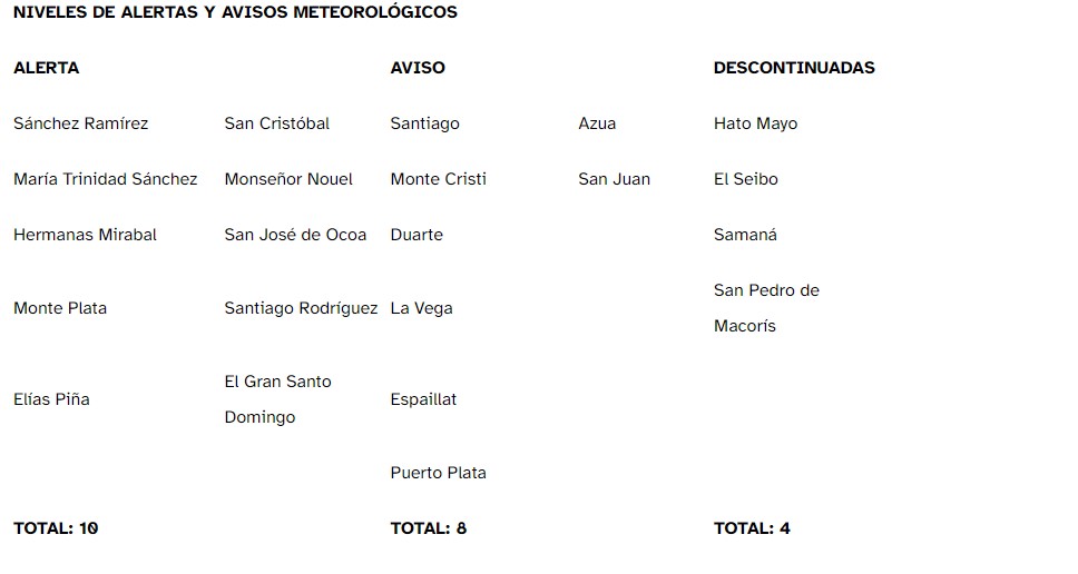 En la costa Atlántica, desde Montecristi hasta Cabo San Rafael (La Altagracia), se recomienda a los operadores de frágiles y pequeñas embarcaciones permanecer en puerto, debido a viento y oleaje peligroso. Mientras para las demás áreas en la costa Atlántica, deberán navegar con precaución, próximo al perímetro costero, sin arriesgarse mar adentro.