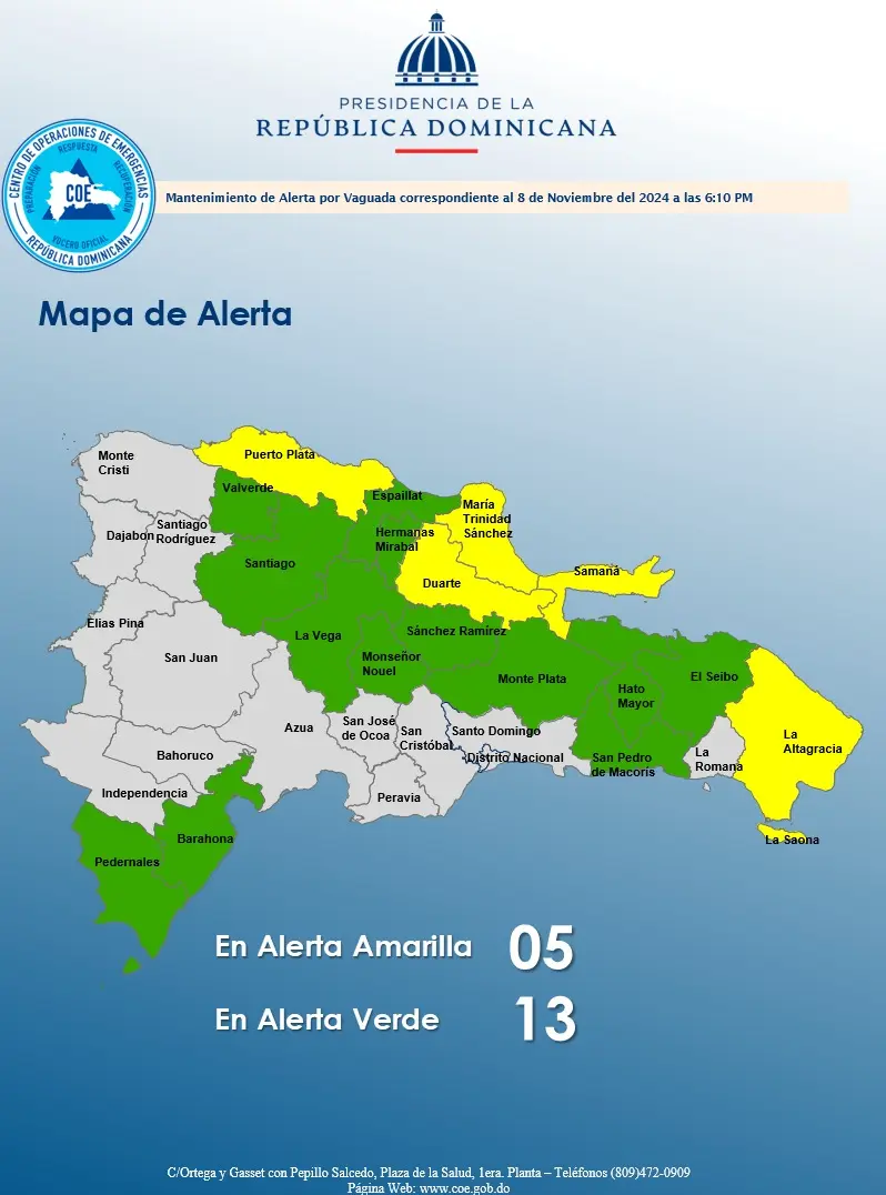 En este sentido, el COE indicó que las provincias en alerta amarilla son: Puerto Plata, Samaná, María Trinidad Sánchez, Duarte y La Altagracia. Mientras que en verde están: Espaillat, Valverde, Barahona, Hato Mayor, El Seibo, Santiago, Dajabón, Monseñor Nouel, Santiago Rodríguez, San Pedro de Macorís, Hermanas Mirabal, Pedernales y Montecristi.