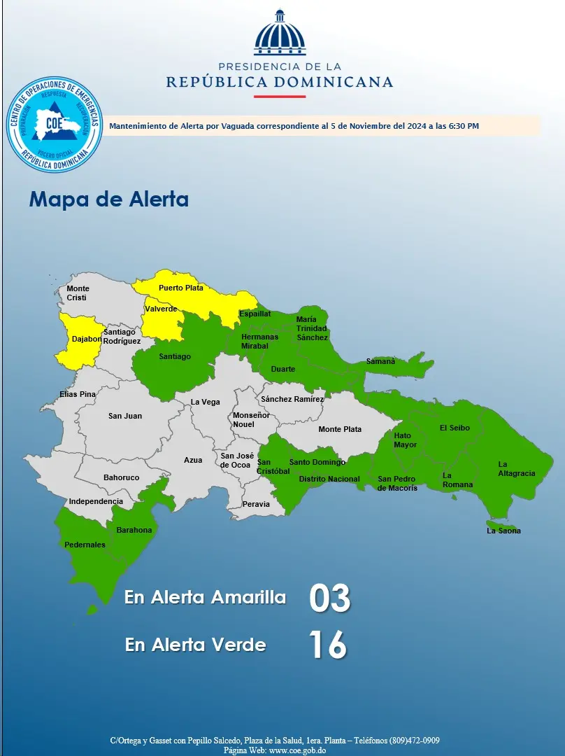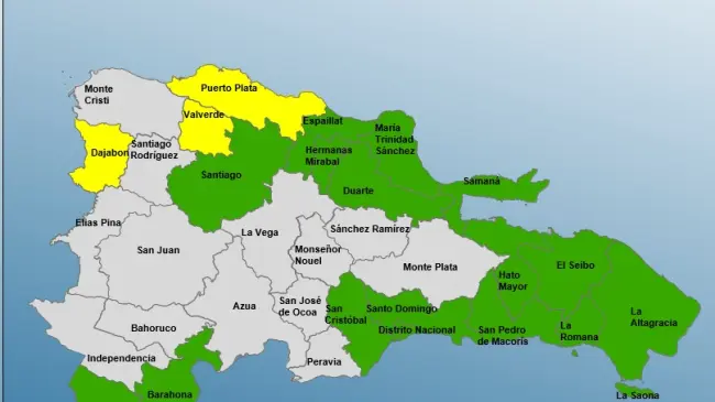 En este sentido, disminuyen las provincias en alerta amarilla: Puerto Plata, Valverde y Dajabón, en tanto que en verde están: Barahona, Duarte, Espaillat, Pedernales, Santo Domingo, Samaná, La Altagracia, Santiago, Hermanas Mirabal, María Trinidad Sánchez, San Pedro de Macorís, San Cristóbal, Hato Mayor, La Romana, Distrito Nacional y El Seibo.