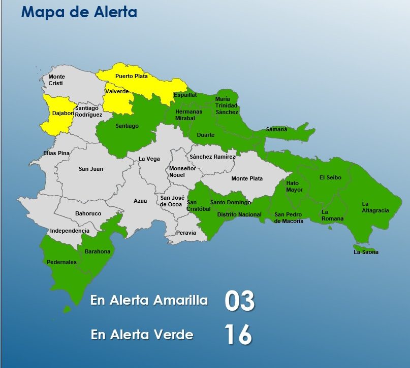 En este sentido, disminuyen las provincias en alerta amarilla: Puerto Plata, Valverde y Dajabón, en tanto que en verde están: Barahona, Duarte, Espaillat, Pedernales, Santo Domingo, Samaná, La Altagracia, Santiago, Hermanas Mirabal, María Trinidad Sánchez, San Pedro de Macorís, San Cristóbal, Hato Mayor, La Romana, Distrito Nacional y El Seibo.