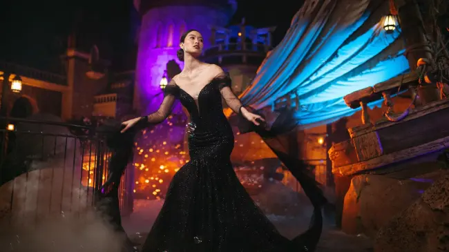 Inspirado en la villana de la película de Walt Disney 'Blancanieves y los siete enanitos', el vestido en negro, marfil o dorado de la Reina Malvada está decorado con volantes, encajes, adornos florales en 3D y cuentas y lentejuelas delicadamente cosidas sobre tul.