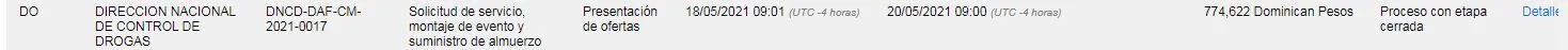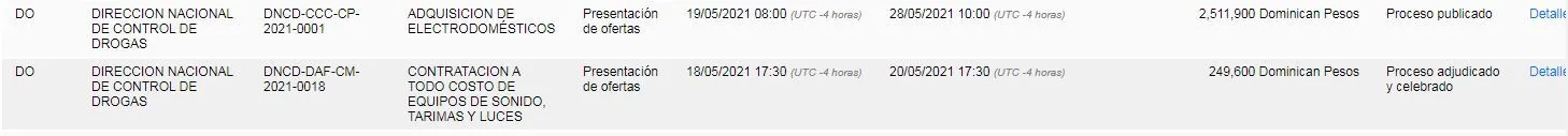 En otra licitación, la DNCD gastaría 249,600 pesos en la contratación de sonido, tarimas y luces para la actividad. Según el Portal de Compras y Contrataciones el proceso fue adjudicado.
