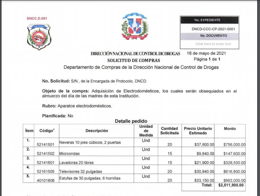 SANTO DOMINGO, República Dominicana.- La Dirección Nacional de Control de Drogas (DNCD) abrió un proceso de licitación por un monto de 2,511,900 de pesos para la adquisición de 90 electrodomésticos, los cuales serán obsequiados en un almuerzo de la institución del Día de las Madres, que celebra este domingo 30 de mayo.
