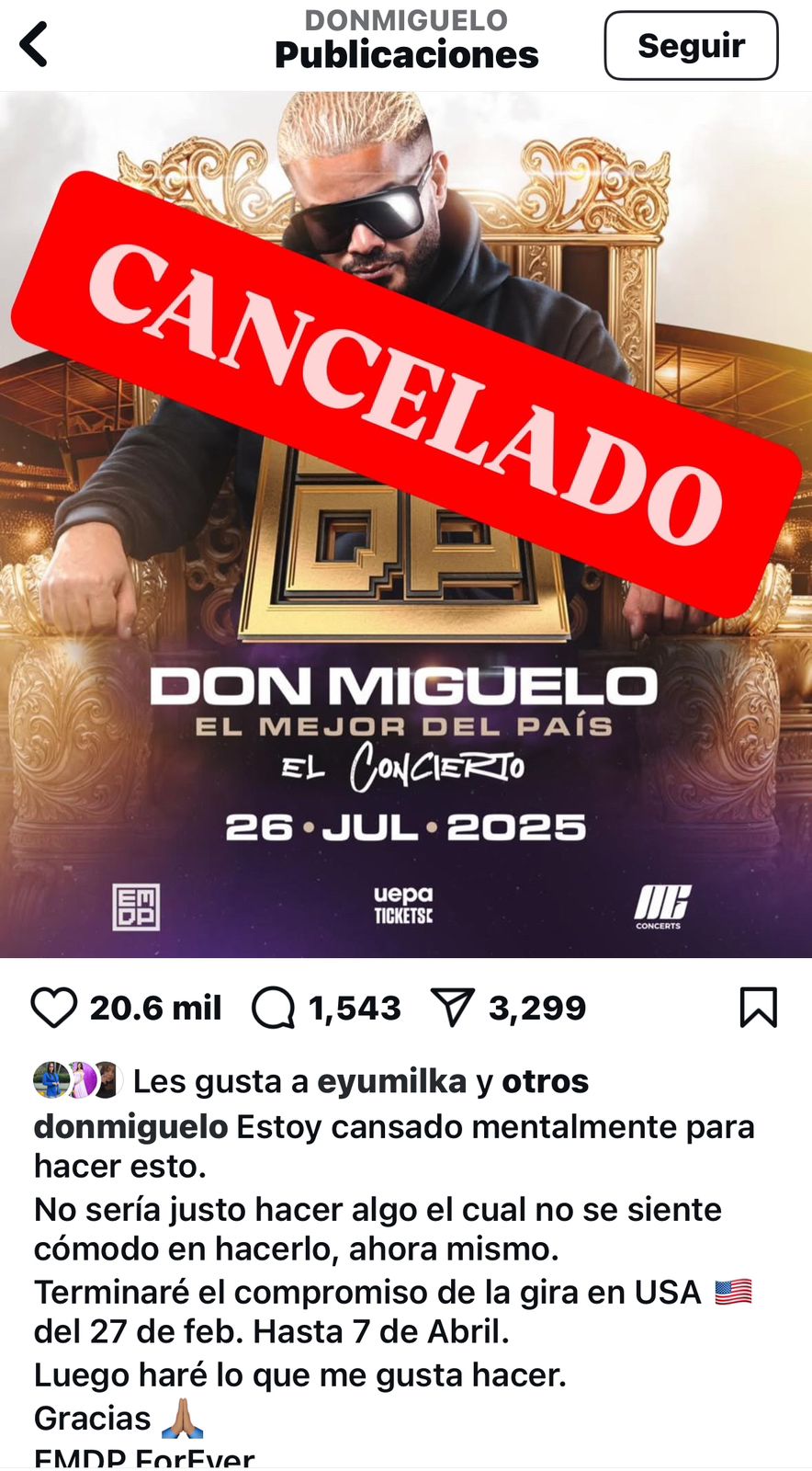 REDACCIÓN.– REDACCIÓN.- El cantante urbano Don Miguelo canceló su concierto en el Estadio Quisqueya programado para el 26 de julio de 2025 en el marco de la celebración de sus 20 años en la industria musical.