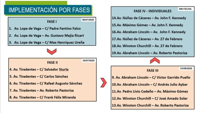 - Una Fase IV, que incluye intersecciones altamente transitadas como la John F. Kennedy con Máximo Gómez, Lincoln y Núñez de Cáceres, será implementada más adelante, en fechas aún por definir.