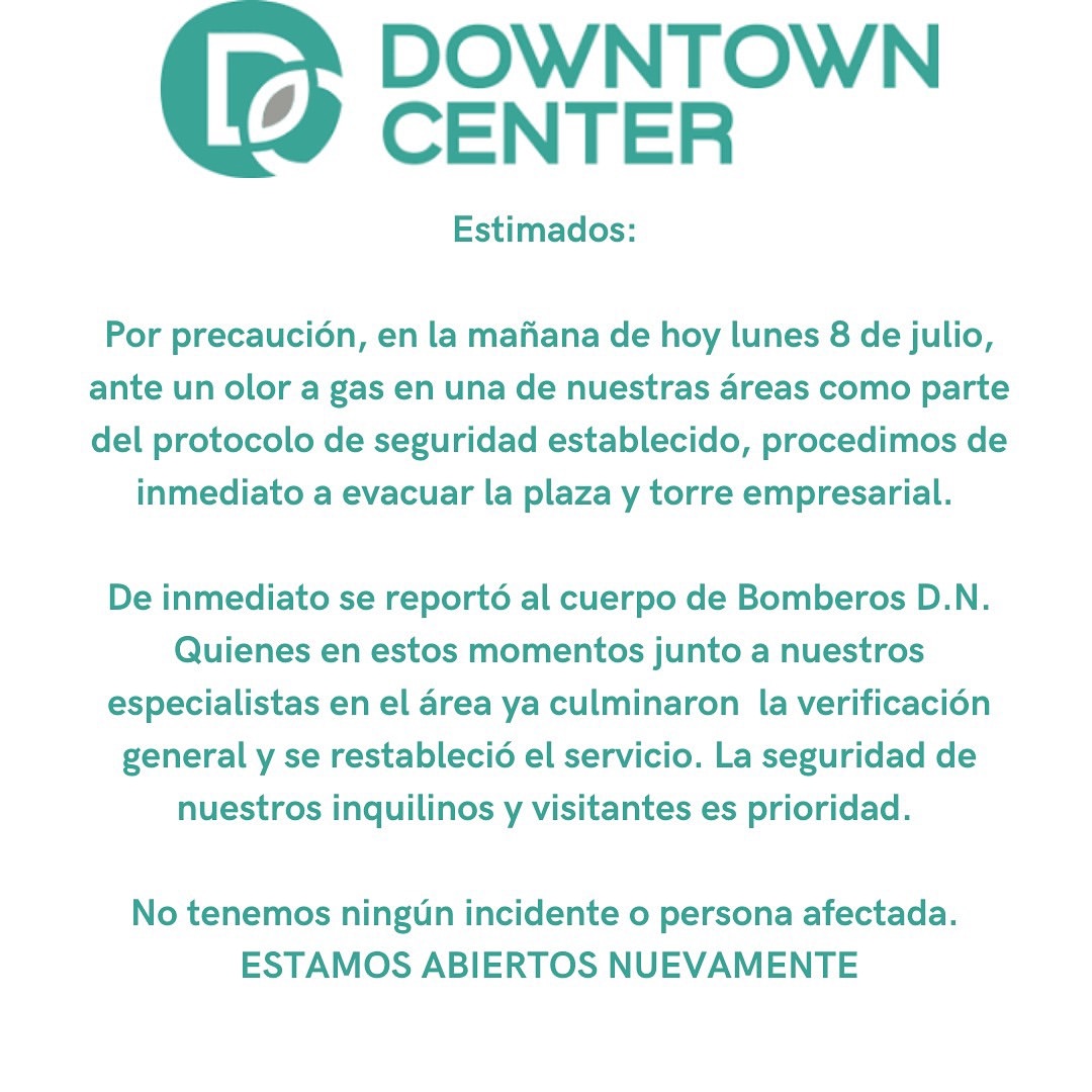 "Por precaución, en la mañana de hoy lunes 8 de julio, ante un olor a gas en una de nuestras áreas como parte del protocolo de seguridad establecido, procedimos de inmediato a evacuar la plaza y torre empresarial", explica Downtown.