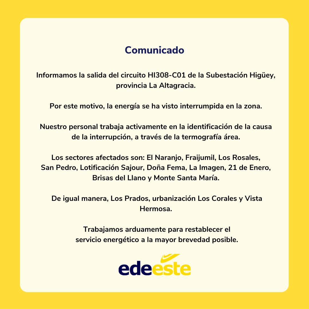 Santo Domingo.– Santo Domingo.- EDEESTE informó a través de un comunicado la salida del circuito HI308-C01 de la subestación Higüey, provincia La Altagracia y además que sería interrumpida la energía en la zona.