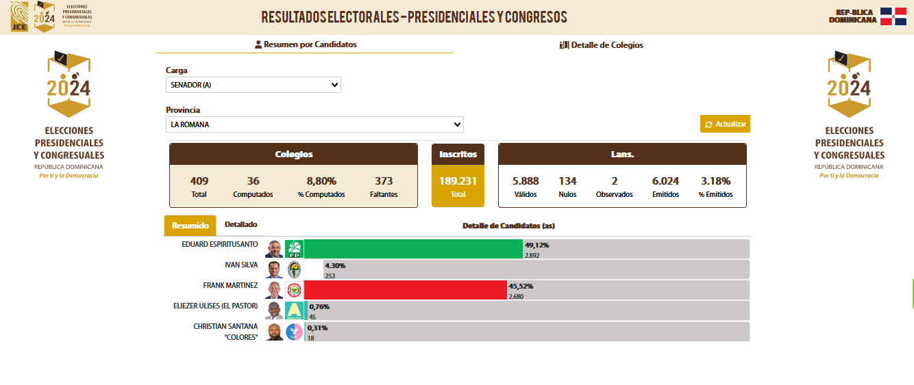 REDACCIÓN.– REDACCIÓN.- El candidato a senador de La Romana por el partido Fuerza del Pueblo (FP), Eduard Espiritusanto, picó adelante con un 49.12% de los votos para ganar la senaduría en La Romana, provincia La Altagracia.