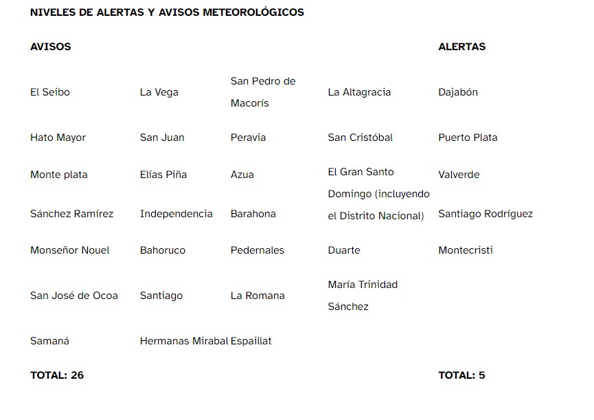 La ONAMET debido a las lluvias ocurridas y las que se esperan en los próximos días, mantiene los niveles de avisos y alertas meteorológicas ante posibles crecidas repentinas de ríos, arroyos y cañadas, generadores de inundaciones urbanas y/o rurales, así como, deslizamientos de tierra para las siguientes provincias.