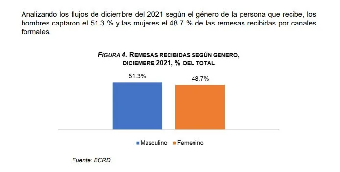 SANTO DOMINGO.- El Banco Central de la República Dominicana (BCRD) indicó este lunes que el 51.3% de las remesas del mes de diciembre del 2021 fueron recibidas por los hombres y un 48.7% por las mujeres, por canales formales.