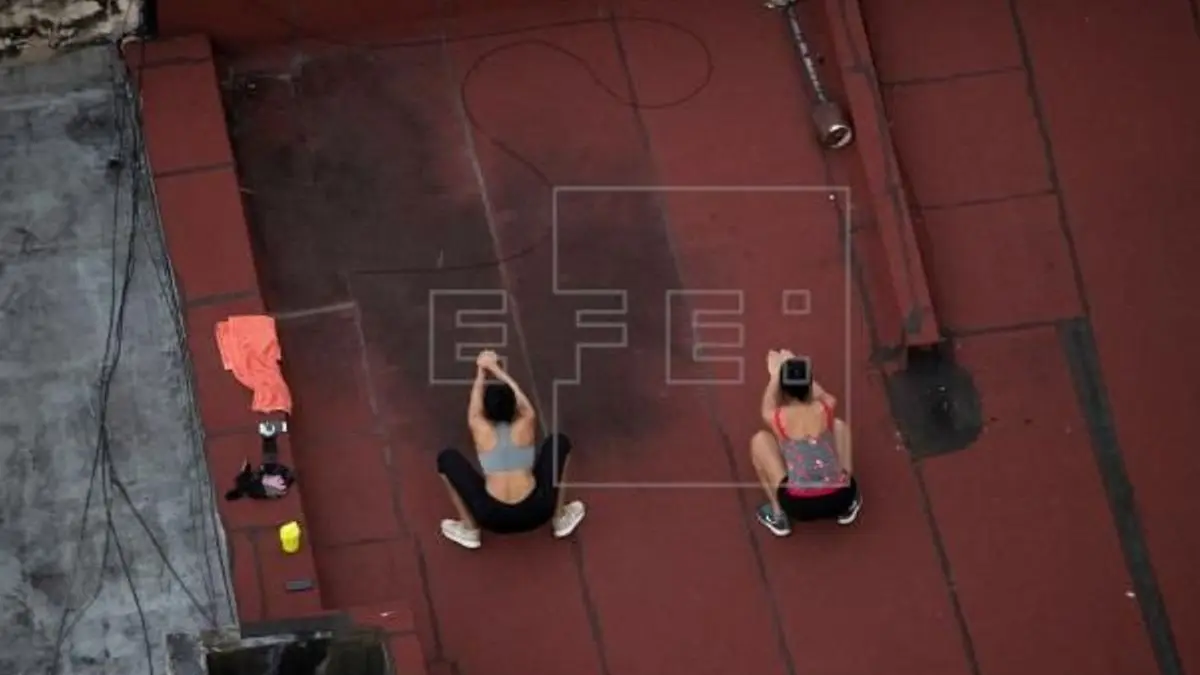 Mientras un señor de avanzada edad ha hecho de la azotea de su vivienda un circuito por el que caminar, otros se montan su particular gimnasio elevado, entregándose al fitness, improvisando unas pesas con una mochila bien cargada o jugando a algo parecido al voleibol.