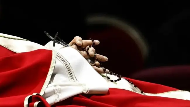 Antes de entrar en la basílica, el papa Francisco que presidió el funeral se detuvo de pie algunos minutos delante del féretro y puso su mano sobre él.